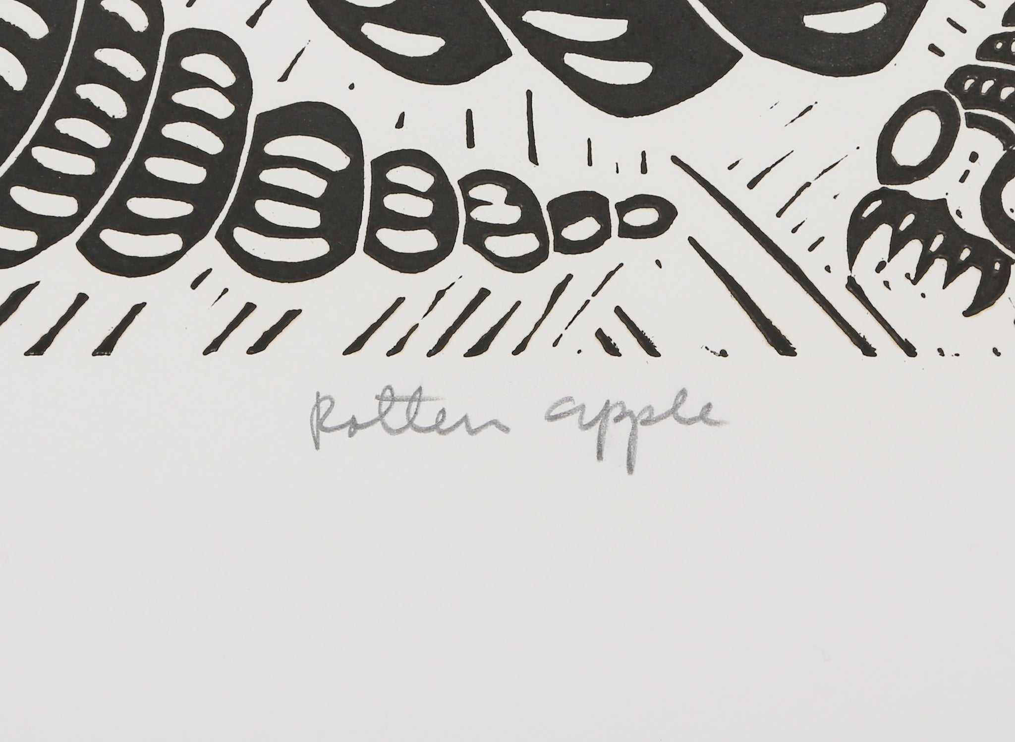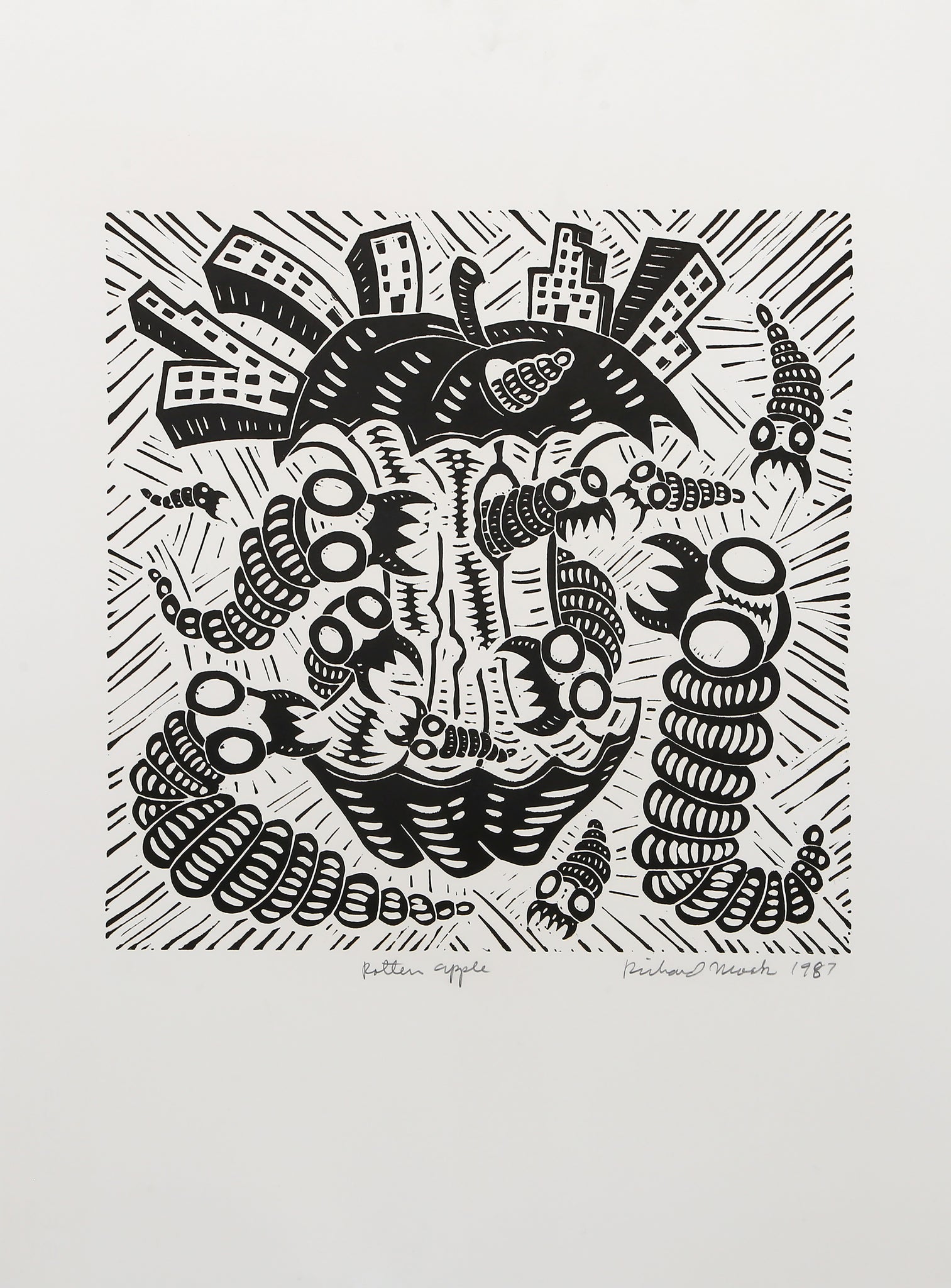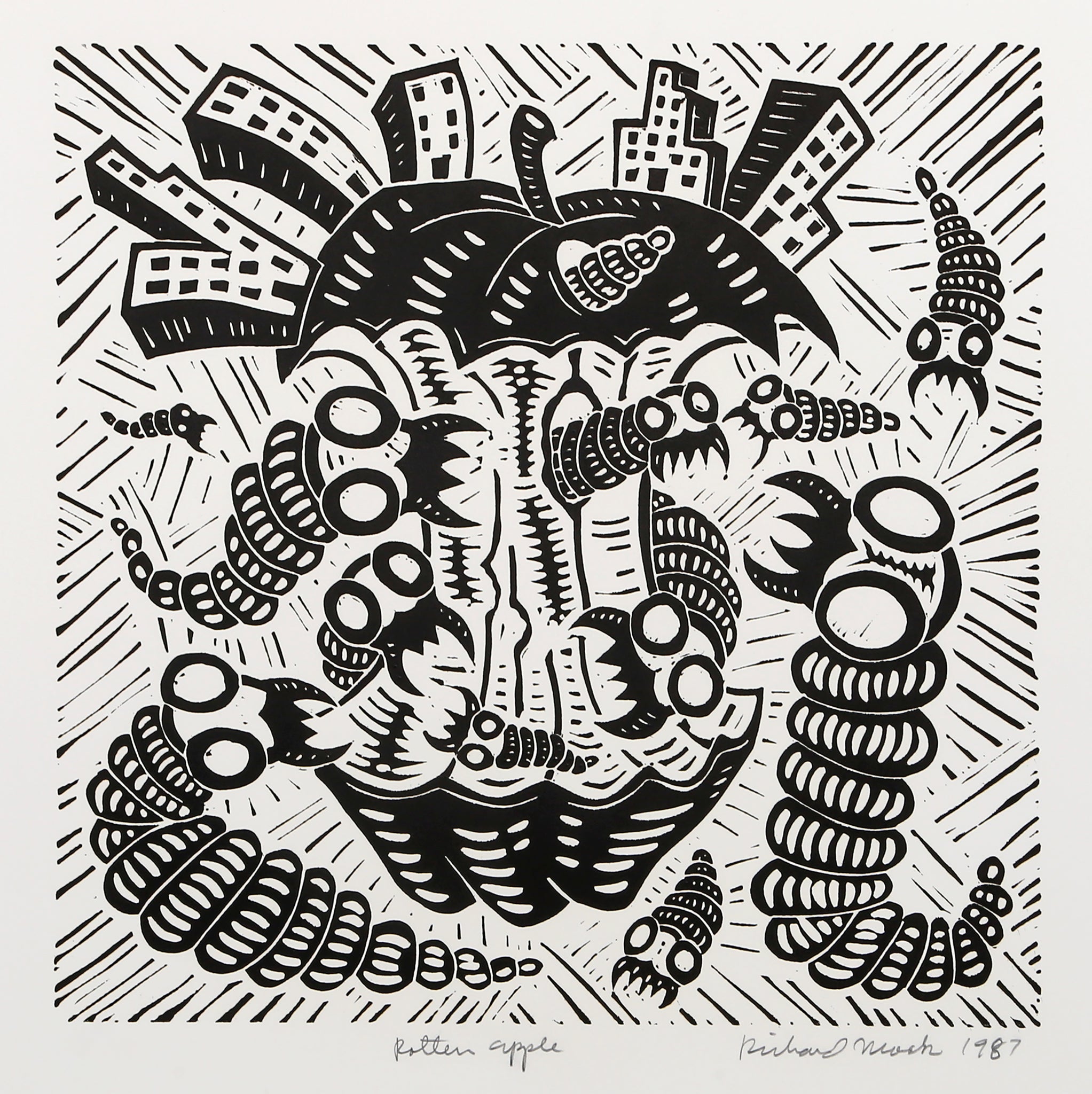 Richard Mock, American (1944 - 2006) - Rotten Apple. Year: 1987, Medium: Linocut on BFK Rives, signed, titled, numbered and dated in pencil, Edition: 80, Image Size: 17 x 17 inches, Size: 30 x 22.25 in. (76.2 x 56.52 cm)