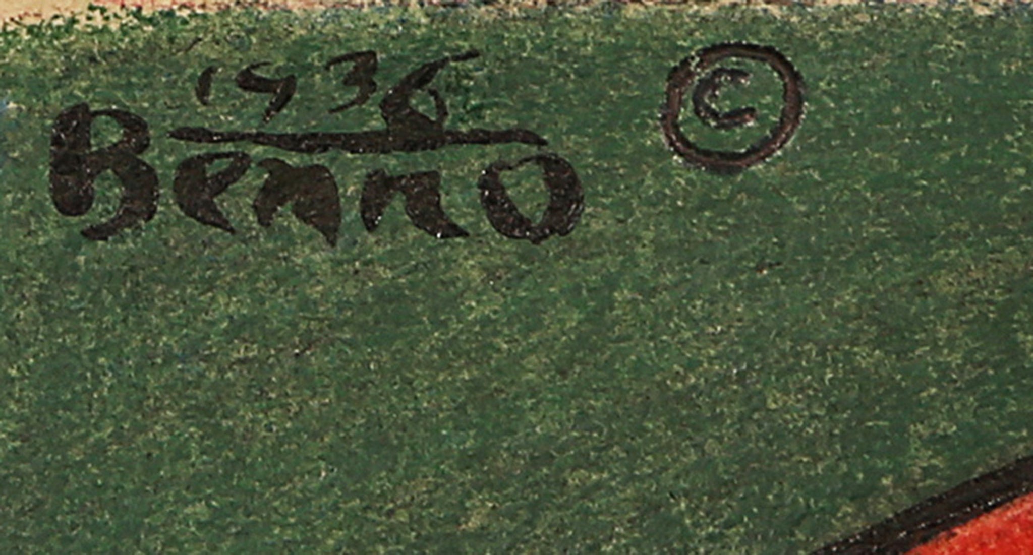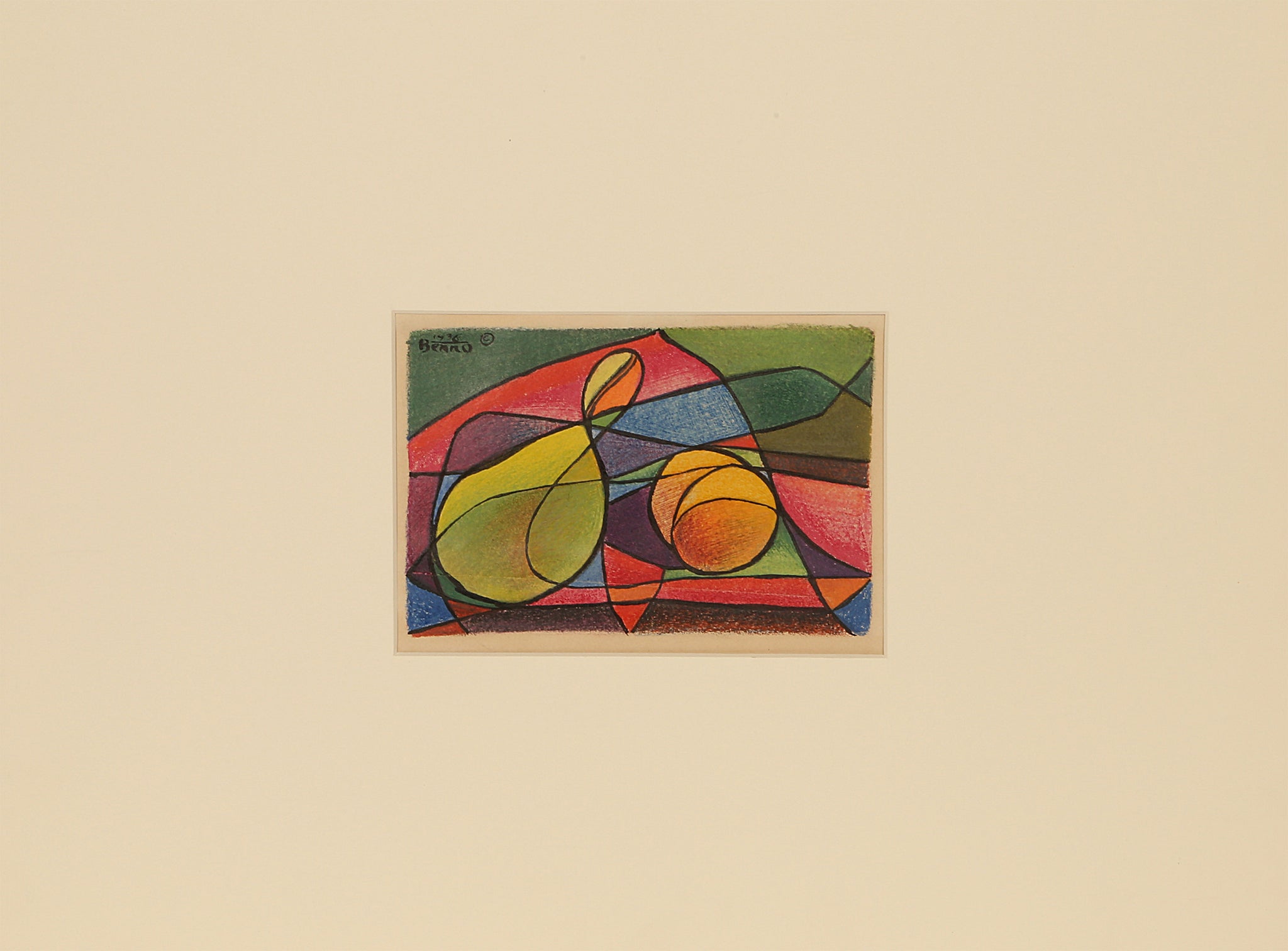 Vibrant, abstract still life of a pear and a peach by artist Benjamin Benno. By the early 1930s he had established a reputation as a member of the international avant-garde and exhibited with the most significant European artists including Paul Klee, Max Ernst, Wassily Kandinsky, Salvador Dalí, Joan Miró, Hans Arp, and Fernand Léger. Pablo Picasso sponsored Benno’s first one-man show in Paris in 1934.