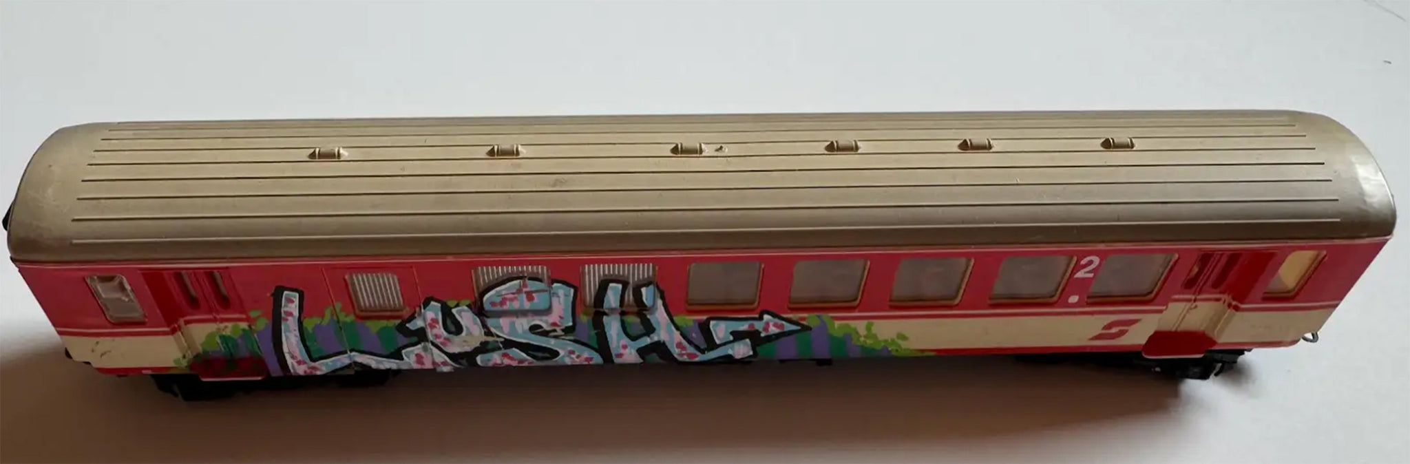 Lush Sux, Australian - Train 7. Year: 204, Medium: Acrylic on Scale Model Train, signed, Size: 3 x 14 x 3 in. (7.62 x 35.56 x 7.62 cm)